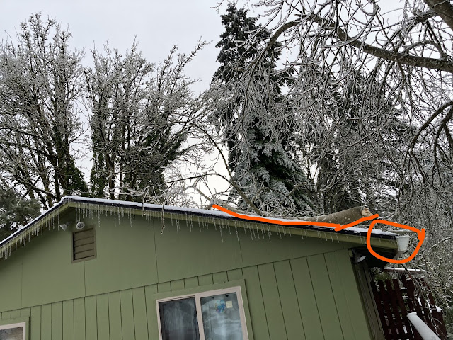 February 12, a light snow, fun. But by the morning of the 13th, the 3 trees I marked in red would have fallen. In addition to many branches falling from the taller trees above. That's just in the frame of this photo. Countless trees and branches fell around and on top of my entire house.